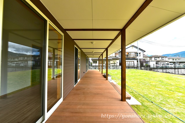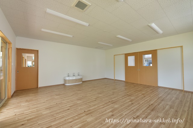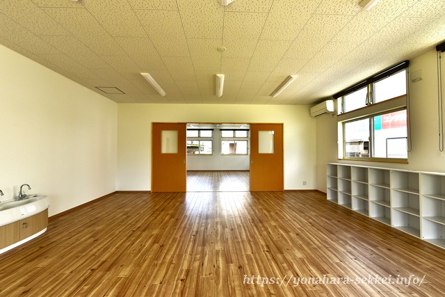 半屋外のウッドデッキスペースを園庭に面して設け、雨天時でもこども達が走り回れる空間となっています。 園庭は芝生広場となっており、子供たちがのびのびと遊びまわれる姿が目に浮かびます。 ■用 途:認定こども園 ■構 造:木造平屋建て ■竣 工:2022年(令和4年)2月 ■延べ面積:207.90㎡