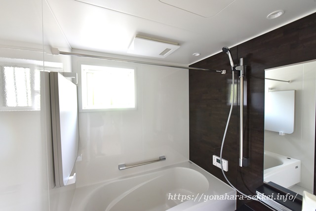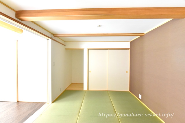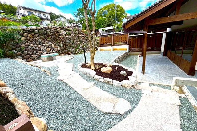 伝統的な木製建具、漆喰塗り外壁、角折れ瓦屋根の外観。内部はシステムキッチン、ユニットバス、空調設備、エコキュートなど現代設備を設置しています。